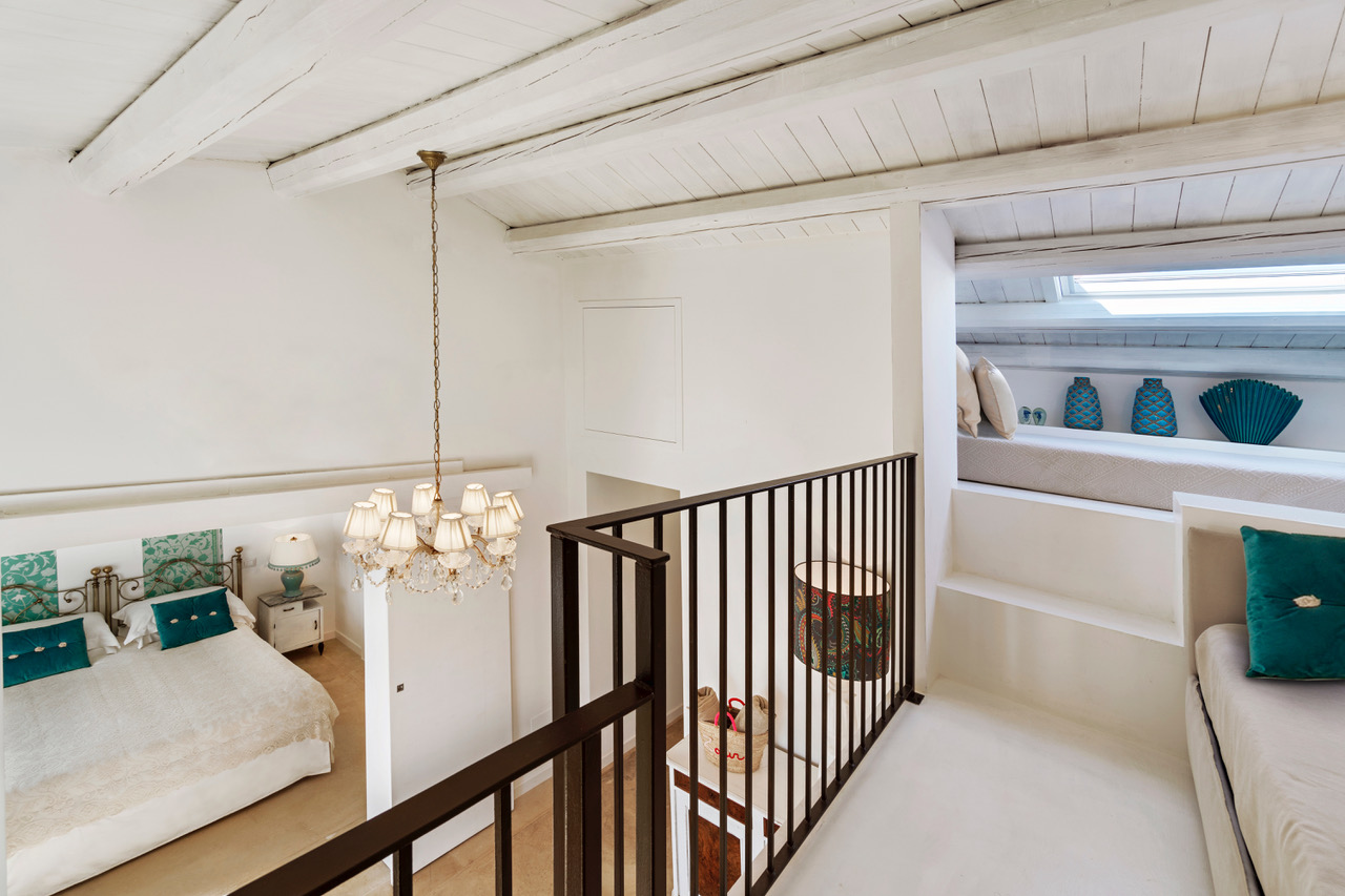 La suite Marzamemi è anche dotata di un’area living con divani e zona lettura, e un soppalco con due letti singoli perfetto per i bambini o per chi viaggia con amici. Gli arredi artigianali, i colori del mare e i dettagli curati rendono questo spazio unico e armonioso.